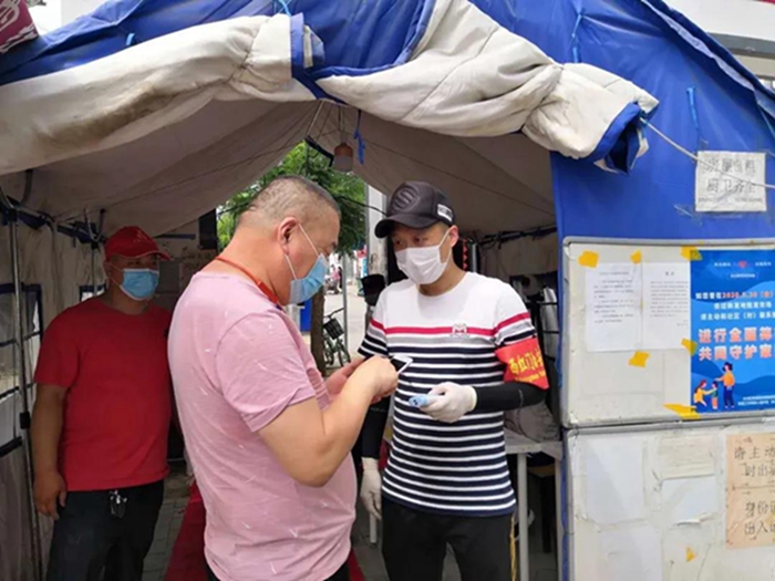 在疫情爆發(fā)后,我主動報名加入到北化集團下沉社區(qū)的防疫工作中,負責(zé)村子卡口測溫、登記等進出管控,像是一扇大門,保護著村莊的防疫安全,手中的槍換成了測溫槍,但一樣是為了保衛(wèi)人民,守衛(wèi)老百姓的安全和健康,不一樣的崗位,不一樣的身份,但我踐行著一樣的使命!
