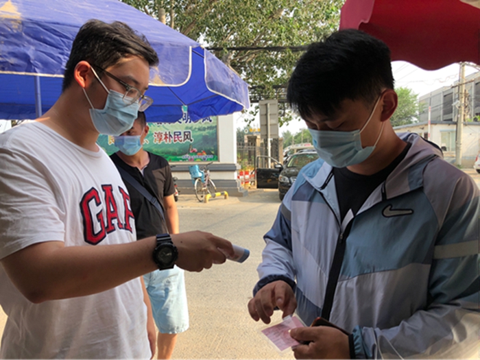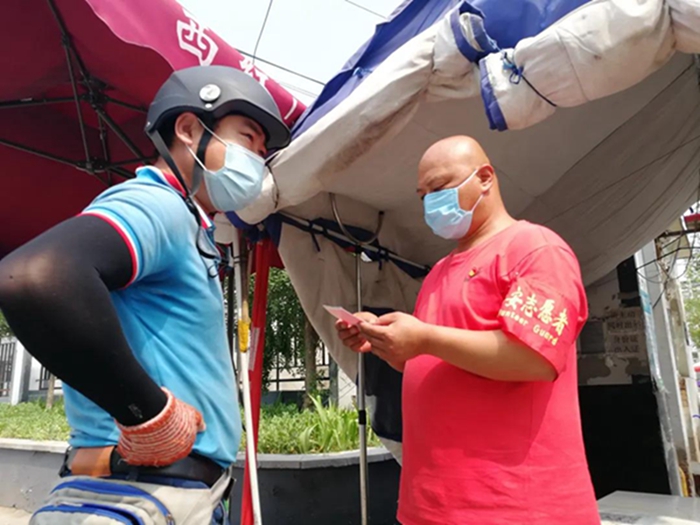 新三余村外來人口較多,進(jìn)出人流量大,值守檢查不能有絲毫的馬虎,在做好自身防護(hù)的情況下,認(rèn)真檢查進(jìn)出人員的出入證與身份證、測(cè)量體溫、并做好登記工作。