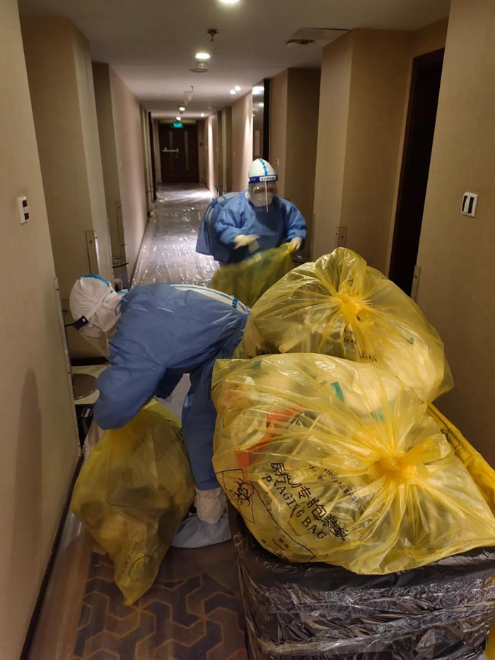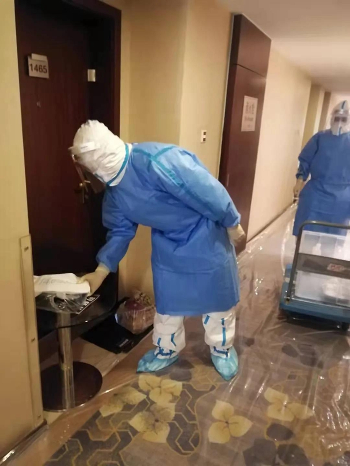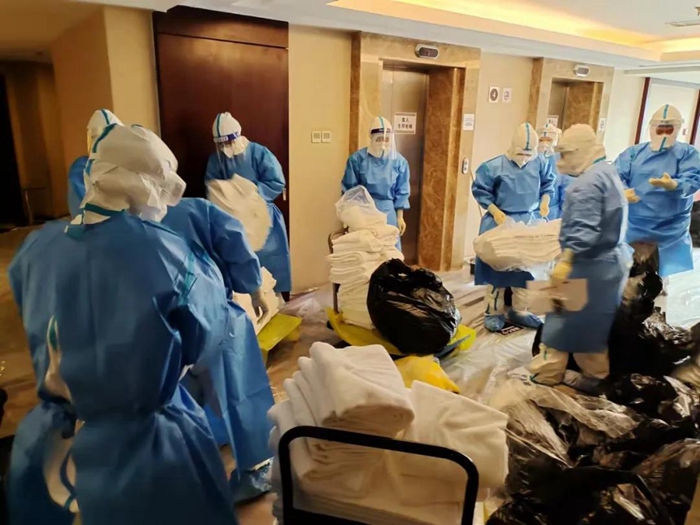困難和挑戰(zhàn)首先體現(xiàn)在前臺(tái)入住、離店手續(xù)、客房清潔的工作流程的較大變化上。前臺(tái)每次接到指揮部通知即將有新隔離人員入住或隔離人員解除隔離時(shí),他們都需要全副武裝穿上防護(hù)服在前臺(tái)等候。每天都有隔離人員解除隔離,離開酒店后,消殺組會(huì)對(duì)客房、公共區(qū)域進(jìn)行全面消毒??头糠?wù)組在隔離人員退房后,對(duì)所有隔離人員使用的物品嚴(yán)格按照感染性廢物進(jìn)行處理,處理完畢后重新打掃恢復(fù)房間使用,這對(duì)于從未從事過醫(yī)療行業(yè)的員工來講,是一種全新挑戰(zhàn),在接受了醫(yī)護(hù)人員的緊急培訓(xùn)后,他們嚴(yán)格履行操作流程,對(duì)100多個(gè)房間進(jìn)行了打掃翻房處理,保證了后續(xù)隔離觀察人員的順利入住。