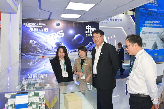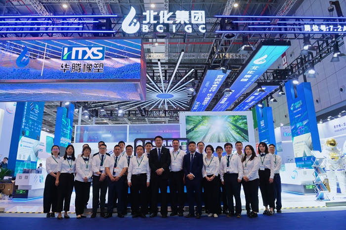 展會(huì)期間,北京化工集團(tuán)黨委副書(shū)記、董事、總經(jīng)理?xiàng)钚褫x,副總經(jīng)理張榮寰,總會(huì)計(jì)師金黎明也來(lái)到集團(tuán)展臺(tái)參觀指導(dǎo)。楊旭輝一行聽(tīng)取了現(xiàn)場(chǎng)各企業(yè)的詳細(xì)介紹,深入了解現(xiàn)場(chǎng)展示的儲(chǔ)氫瓶?jī)?nèi)膽材料、LNG船用膠、航天手套等高精尖產(chǎn)品,親切慰問(wèn)現(xiàn)場(chǎng)工作人員。