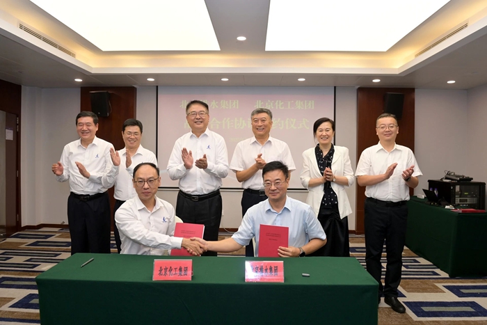 7月15日,北京化工集團(tuán)與北京排水集團(tuán)簽署戰(zhàn)略合作協(xié)議?;ぜ瘓F(tuán)黨委書記、董事長陳宇,黨委副書記、董事、總經(jīng)理?xiàng)钚褫x,黨委常委、副總經(jīng)理孫紹剛,副總經(jīng)理張榮寰;排水集團(tuán)黨委書記、董事長張建新,黨委副書記、職工董事、工會主席王蘭,黨委委員、副總經(jīng)理張志淵出席簽約儀式。