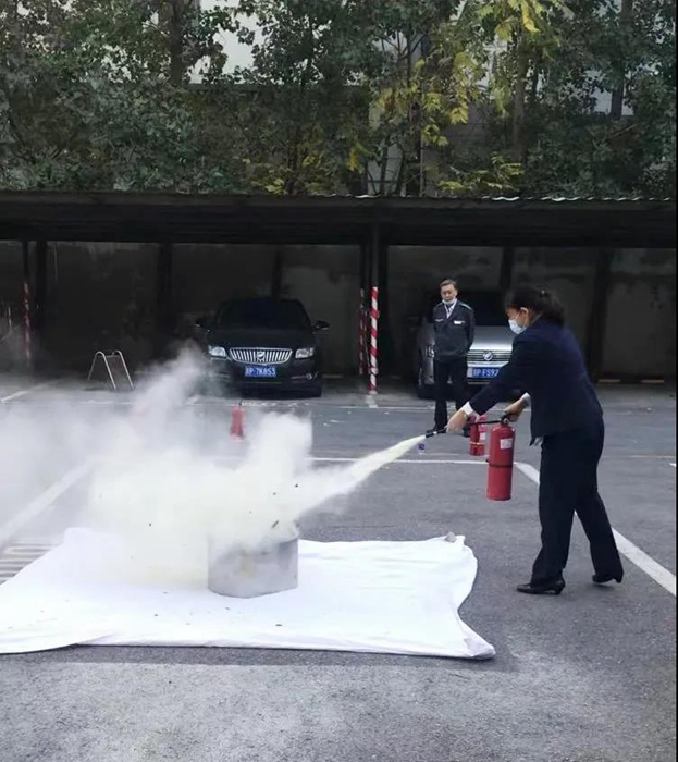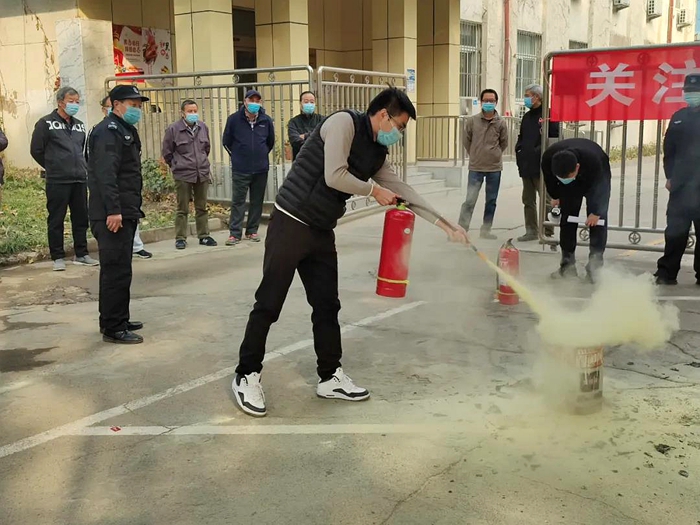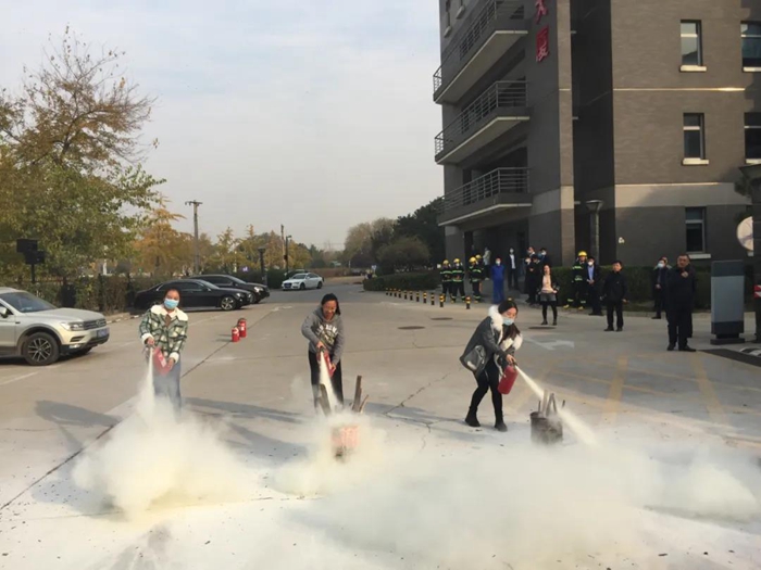 華騰丹陛華公司消防員為參演人員講解了滅火器使用方法和注意事項,參加實戰演練的干部職工們逐一提起干粉滅火器,進行實戰操作。