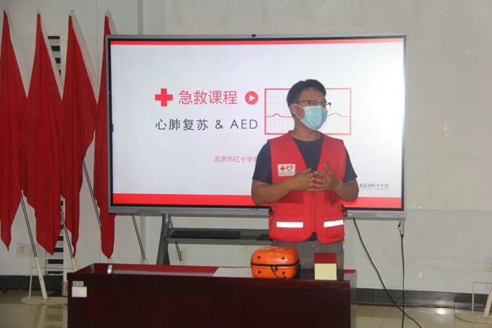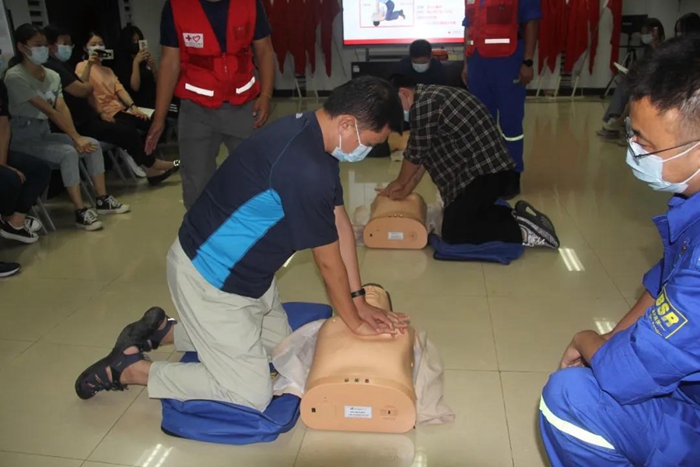 培訓現場,紅十字會講師講解了意外情況下的心肺急救知識,并利用模擬假人詳細講解了心肺復蘇術和自動體外除顫器(AED)的操作要領。